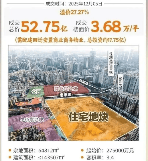 海珠西南泰路地块(翠城花园东地块)自出让以来便备受市场关注,该地块经过76轮激烈竞价,最终被保利以350000万元总价斩获,叠加需无偿移交的商业配建成本165201.4万元,房企实际总支出超51亿元。近日,广州规自局正式发布该地块(原南泰批发市场地块)的修规方案,诸多核心规划落地,让项目的均好性与确定性大幅提升,成为海珠西楼市的焦点。地块住宅部分占地42208平方米,容积率3.4,总建面143507平方米,住宅成交楼面价超3.6万/平,凭借低容积率、全维度配套等优势,尚未亮相便已锁定海珠西改善市场核心地位。