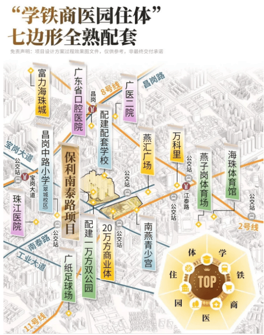 保利南泰路地块周边配套成熟,医疗、商业等设施一应俱全,完全满足日常居住需求。医疗方面,项目沿南泰路直行约400米,即可到达南方医科大学珠江医院,步行仅需4分钟,这所超大型三甲医院,医疗设备先进、诊疗水平高超,为家人健康提供坚实保障,日常就医、体检无需长途奔波。商业方面,除了周边成熟的沿街商铺与社区底商,满足日常烟火需求外,项目自身规划有20万方大型商业综合体,体量超越太古汇,将成为海珠西最大的地标式商业体,填补区域高端商业空白。此外,地块东侧临近燕汇广场,往北可直达万科里、乐峰广场等大型商圈,购物、餐饮、娱乐一站式搞定,步行或短途车程均可抵达,兼顾日常便利与高阶消费需求。